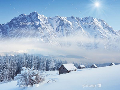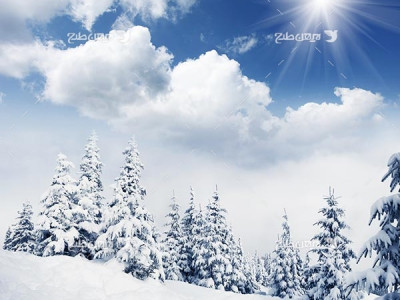 تصویر منظره برفی و برف و درخت کاج، ابر و...