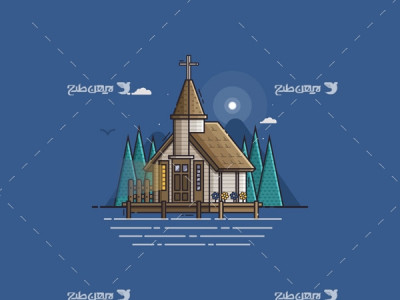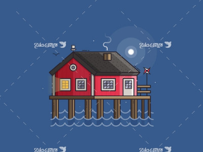وکتور گرافیکی دریا ، کوه و خانه چوبی