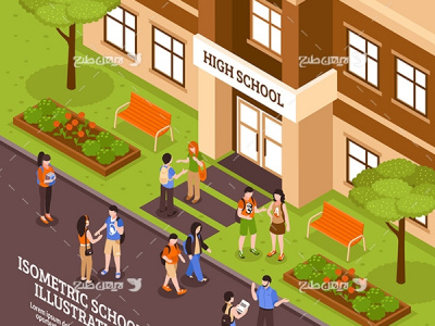 طرح وکتور سه بعدی دانش آموزان و مدرسه رایگان